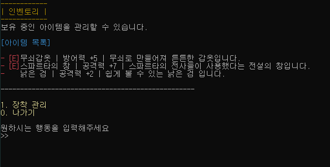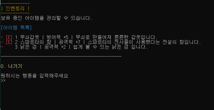 - 보유 중인 아이템을 전부 보여줍니다. 이때 장착중인 아이템 앞에는 [E] 표시를 붙여 줍니다.