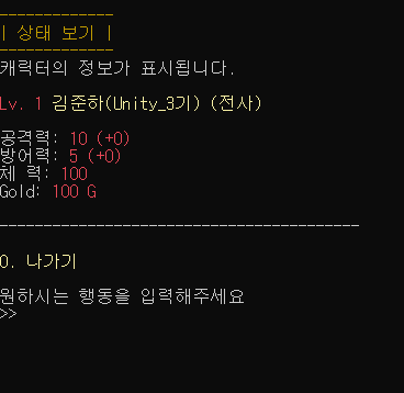 - 7개의 속성을 가지고 있습니다. 레벨 / 이름 / 직업 / 공격력 / 방어력 / 체력 / Gold