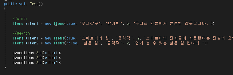 <아이템 클래스의 모습 / Type을 구분해 공격력과 방어력을 구분했다>