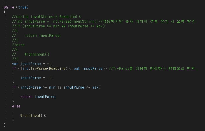 그래서 방법을 알아보았고 TryParse를 이용해 애초에 int로 받을 수 있는 것에만 값을 입력 받도록 할 수 있게 되었다.