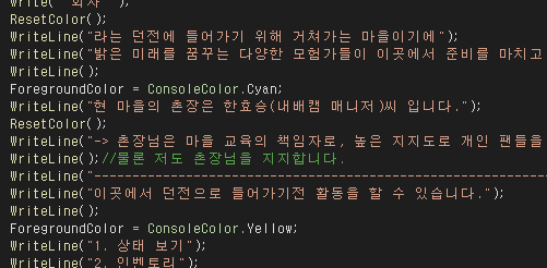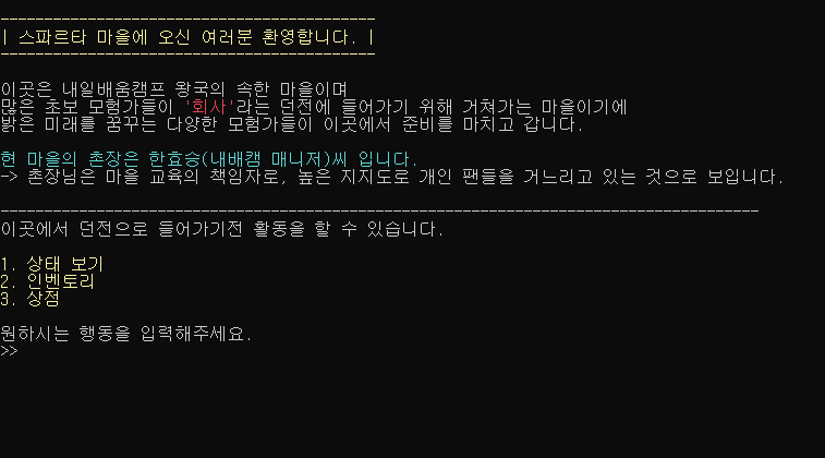- 게임 시작시 간단한 소개 말과 마을에서 할 수 있는 행동을 알려줍니다.