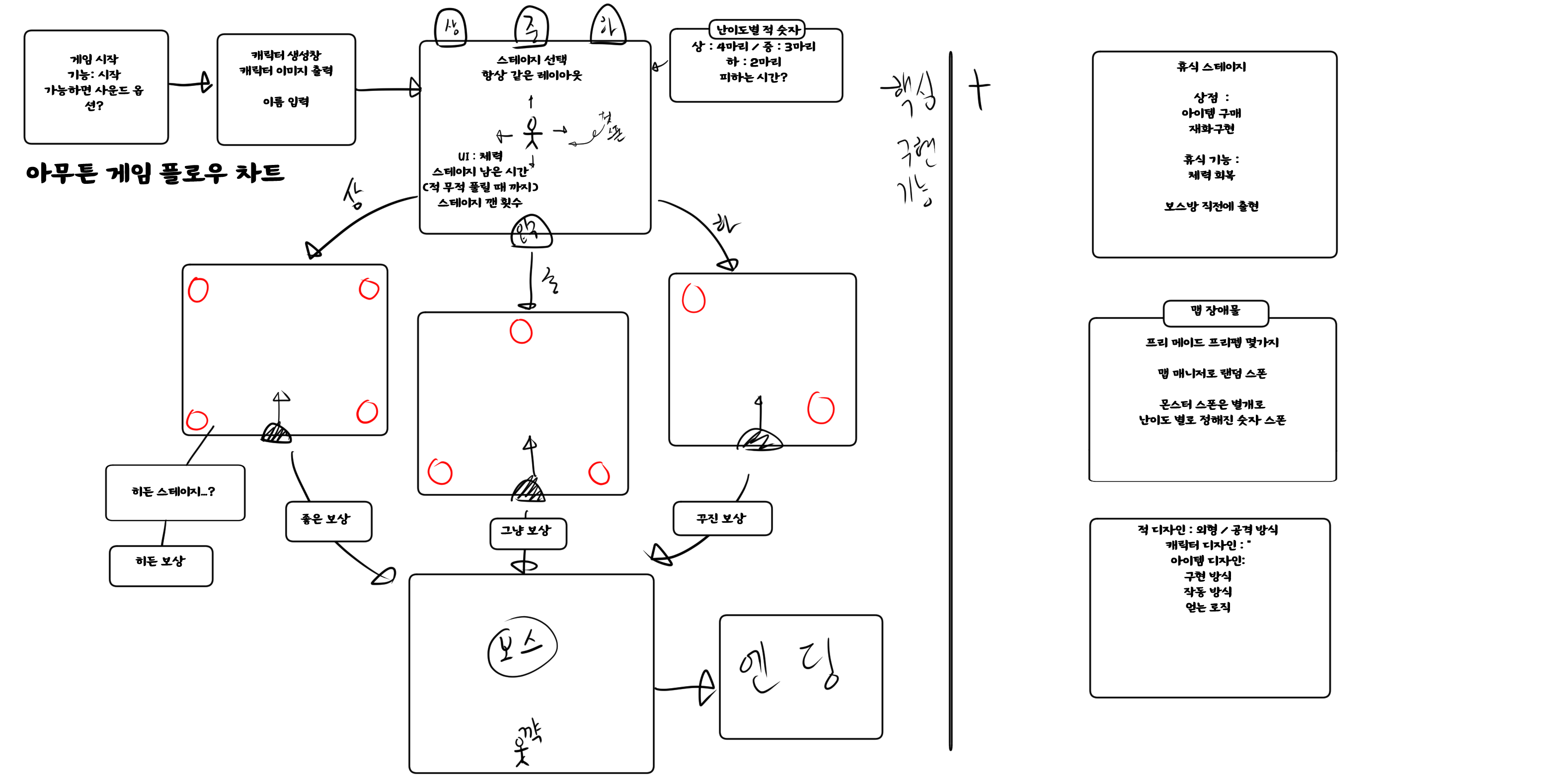이를 위해 게임의 컨셉을 잡으며 플로우 차트를 짜보았다. 이를 위해 내 현란한 그림 실력을 자랑했다.