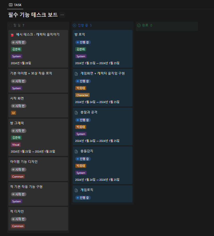 이런 방식으로 필수 기능 / 추가 기능 / 버그 리포트 별 보드를 만들어 두었다.