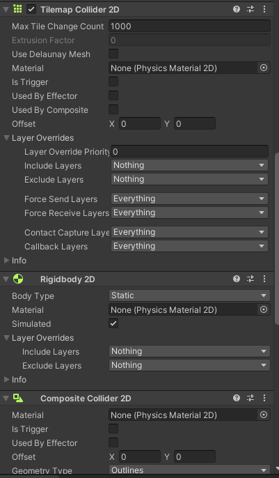 이 벽들은 타일맵 콜라이더와 컴포짓 콜라이더, 리지드 바디를 통해 충돌을 구현하고 있다. 이러한 방식은 따로 콜라이더 타일맵을 까는 방법보다 편한 점이 존재한다. 하지만 그만큼 시각적인 벽과 충돌이 되야하는 벽의 구분을 잘 해두어야 한다.