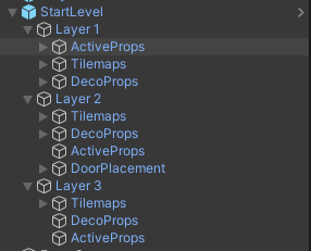 맵은 총 3가지 레이어 (1층 2층 3층)로 존재하며 이들에는 각각 배경이 될 타일 맵과 배경용 프롭들과 충돌처리가 있는 프롭들, 그리고 2레이어에는 각 방을 이동하는 문이 존재하는 방식으로 준비했다.