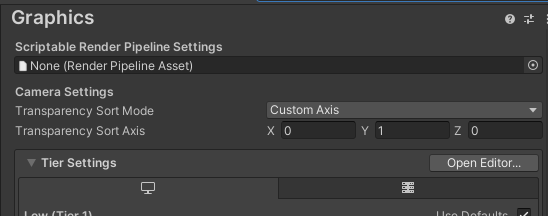 그래서 몇가지 해보다가 알게 된 것이 Graphics 세팅에서 Transparency Sort를 커스텀으로, 3D에 Z축으로 정렬이 아닌 2D에서는 전혀 쓰이지 않는 Z축 대신 Y축을 기점으로 원근을 재는 것이다.