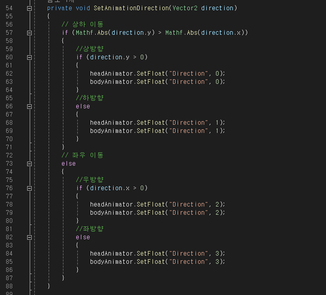 현재 공격 방향이 플레이어 이동 방향으로 고정되어 있기 때문에 이동하는데 쓰는 input값을 받아 공격방향으로 설정해준다.