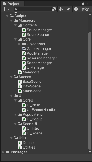 현재 구조를 따라해 보면서 사실상 '게임'으로서 엔진에 구현된 것은 없지만 코드는 계속해서 늘어가고 있다. 항상 비주얼 같은 부분에 신경을 많이 쓰는 나는 굉장히 지루한 과정이지만, 동적 생성을 위해 메인 매니저를 중심으로 여러 매니저를 구분해서 관리하고 있다 보니, Enum을 모아둔 Define과 / 다른 메소드들을 묶어둔 Utilities와 같은 이전에는 따로 만들어보지 못한 것들도 만들어야 하고 있다. 또 UI에 이렇게 많은 비중을 둔 것도 처음이다. 처음인 것이 너무 많아 작업이 너무 느린 느낌이다.