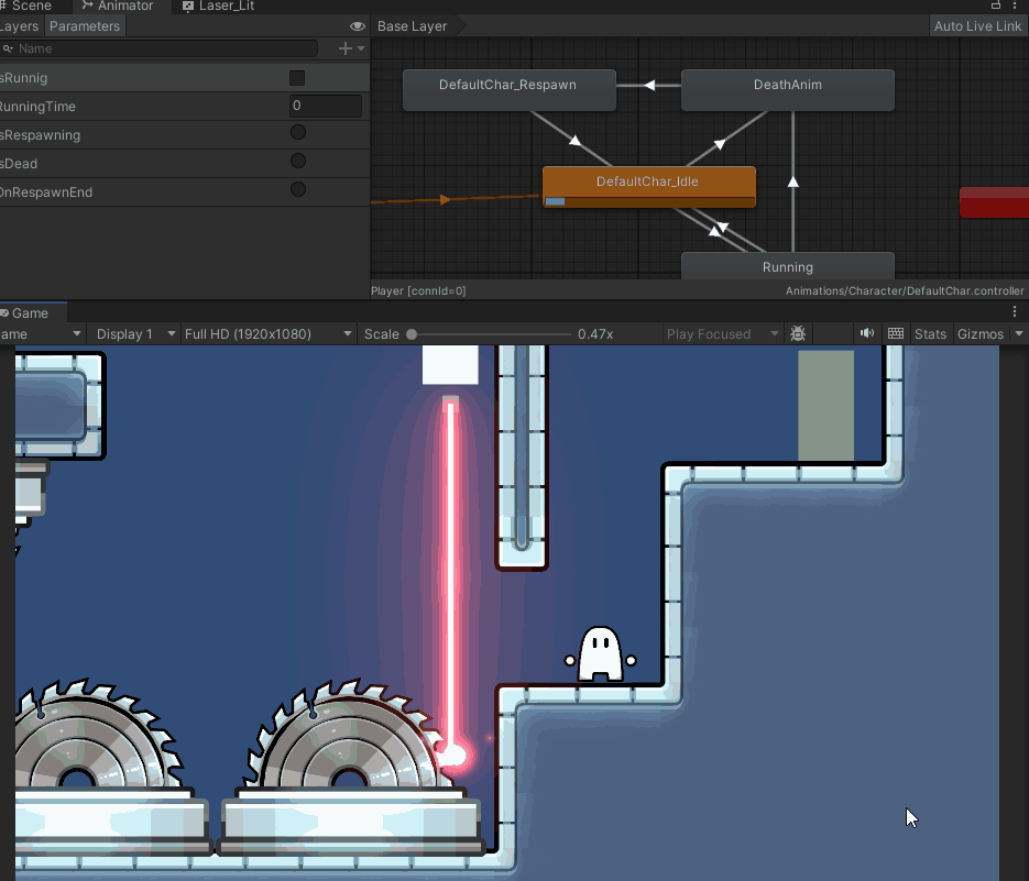 죽는 애니메이션이 실행되며 콜라이더와 리지드 바디가 비활성화 / 프리즈 되어 해당 위치에서 사망 위치 마크가 찍히는 연출 이후 게임의 시작지점으로 트랜스폼을 옮긴 뒤에 리스폰 애니메이션을 실행, 이후 제한걸린 것들을 풀어주는 방식으로 되어있다.