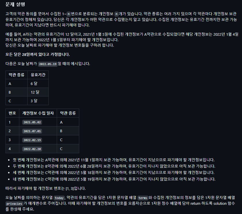 1. 오늘의 알고리즘 코드 카타 - 개인정보 수집 유효 기간