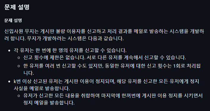 //신고 당한 유저<Key>의 신고 유저 목록<List>을 알면 중복 메일도 신고 당한 유저 Key의 리스트에서 신고한 유저의 신고 횟수를 1회 늘리는 방식